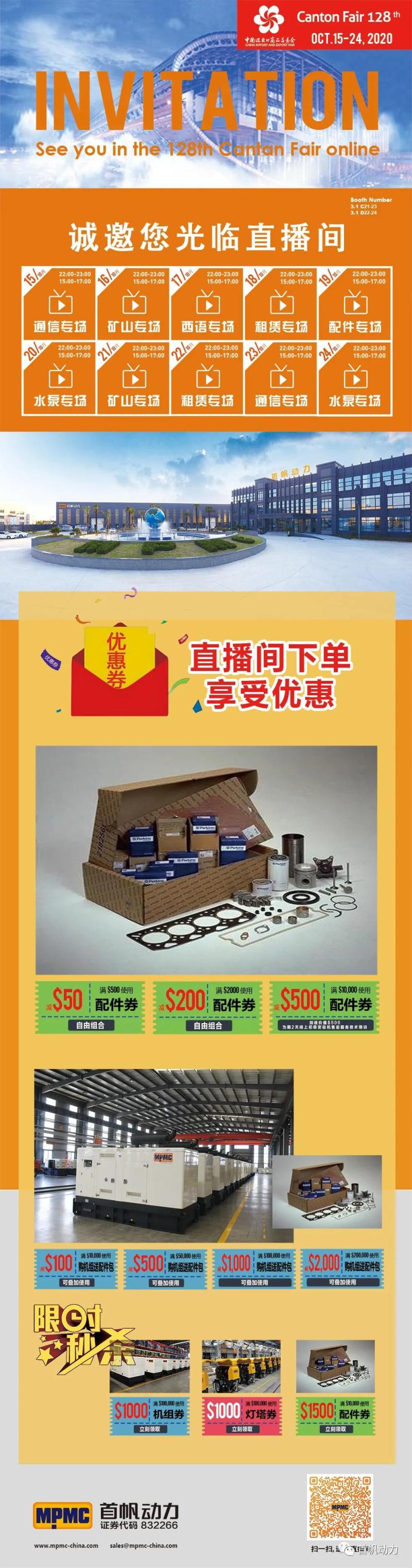第128届中国进出口商品交易会(简称广交会)将于10月15-24日在线上举办,首帆动力如期参加本次线上广交会,并诚邀广大新老客户莅临MPMC展位,我们的展位号为:3.1C21-23,3.1D22-24。